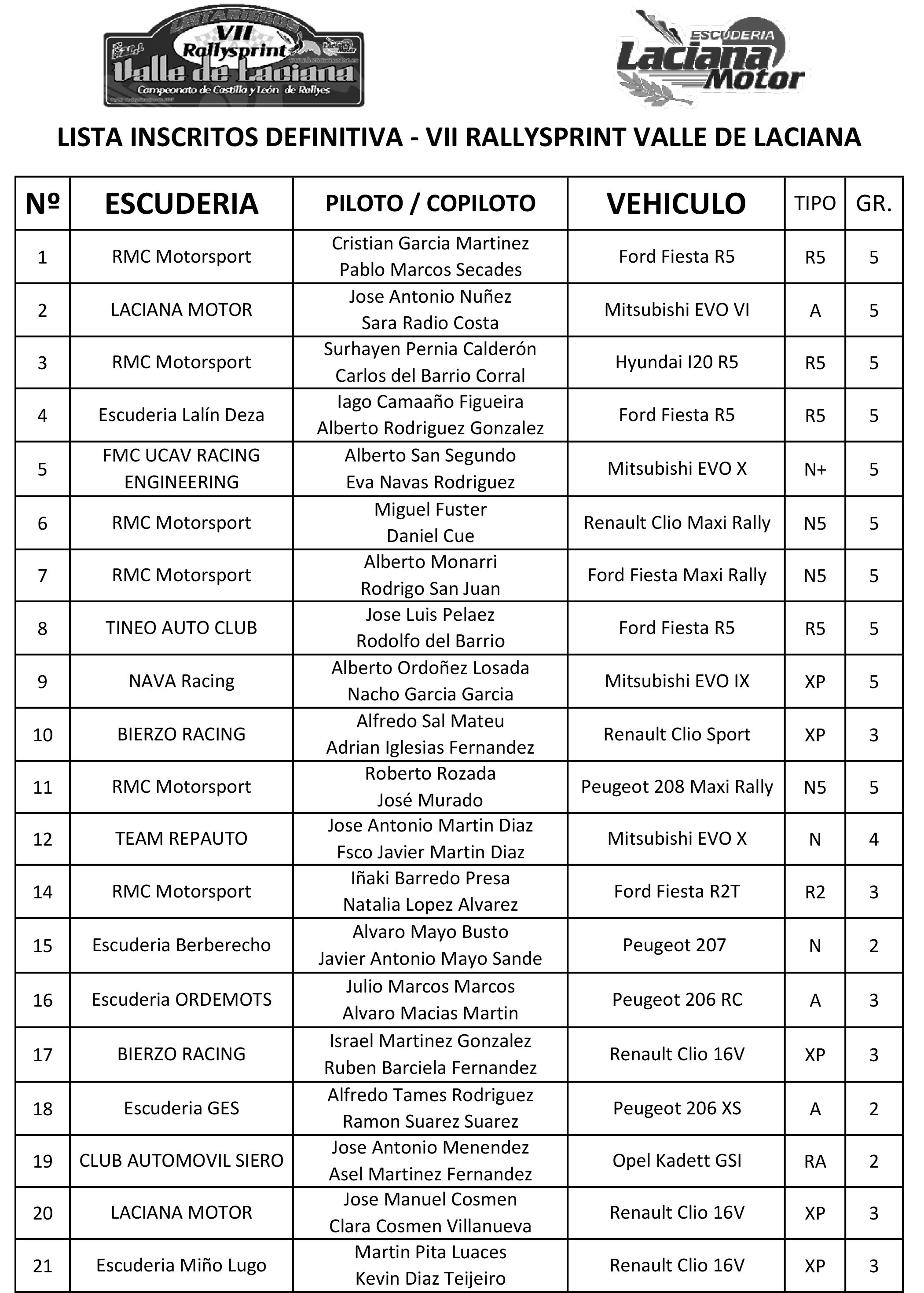 Lista Inscritos VII Rallysprint Valle de Laciana